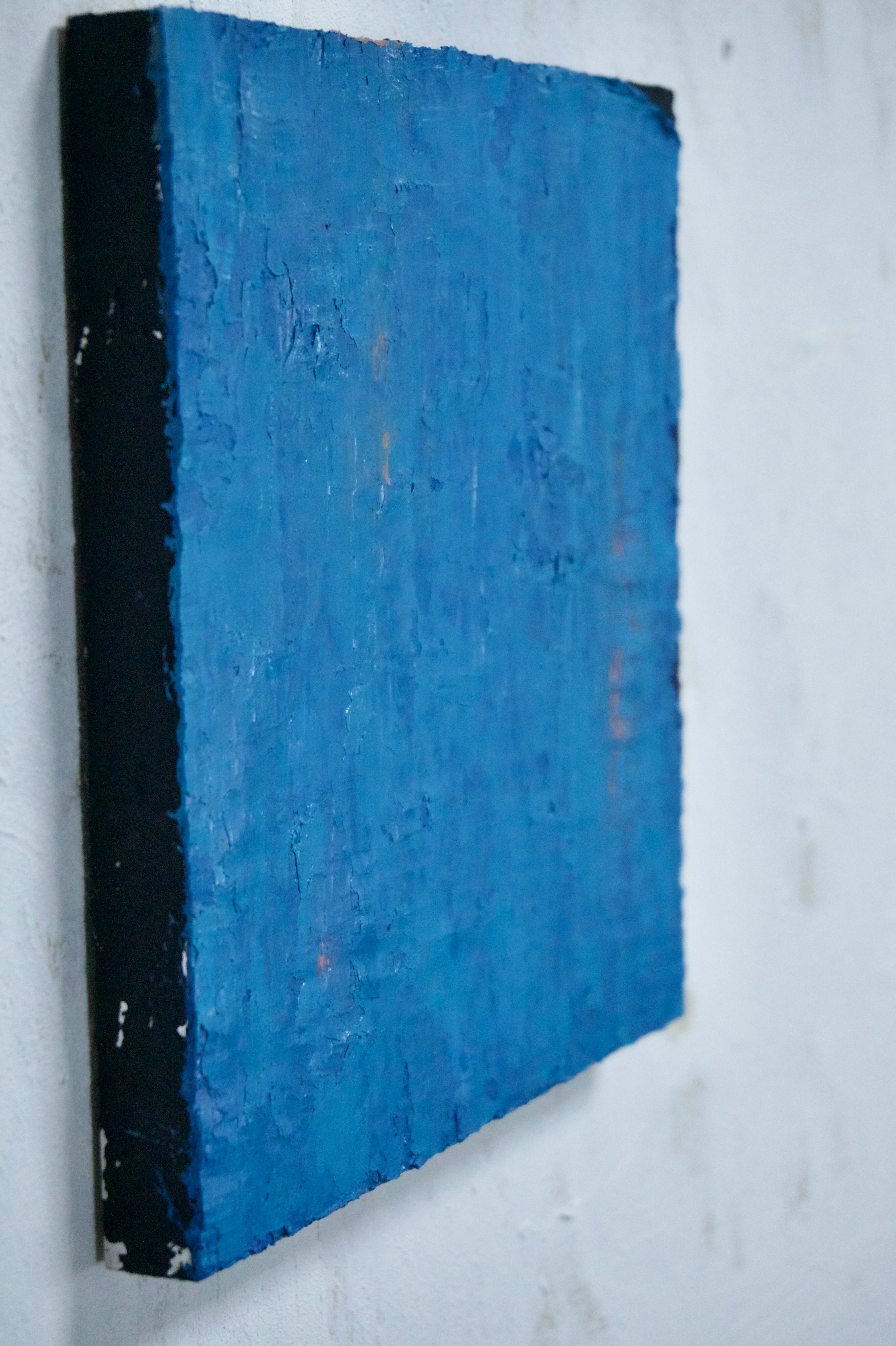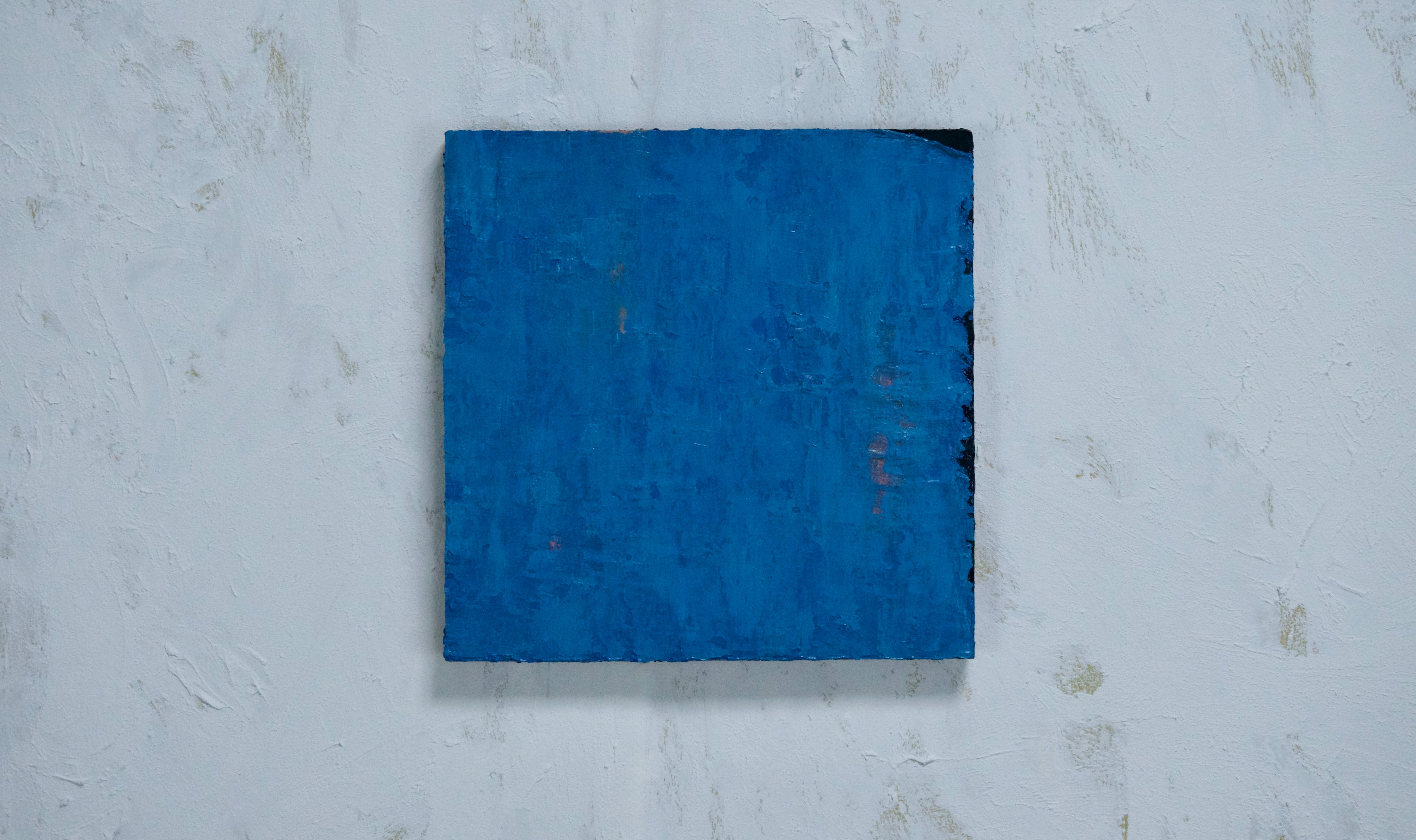 画面下部の黒から、上部の澄んだ青へと移り変わる境界線には、わずかな掠れや色の混ざり合いがあり、それが刻一刻と変化していく光の残像を思わせます。シンプルに削ぎ落とされた構成だからこそ、塗り重ねられた色彩の奥行きが、見る人の心に深く、穏やかに染み渡ります。