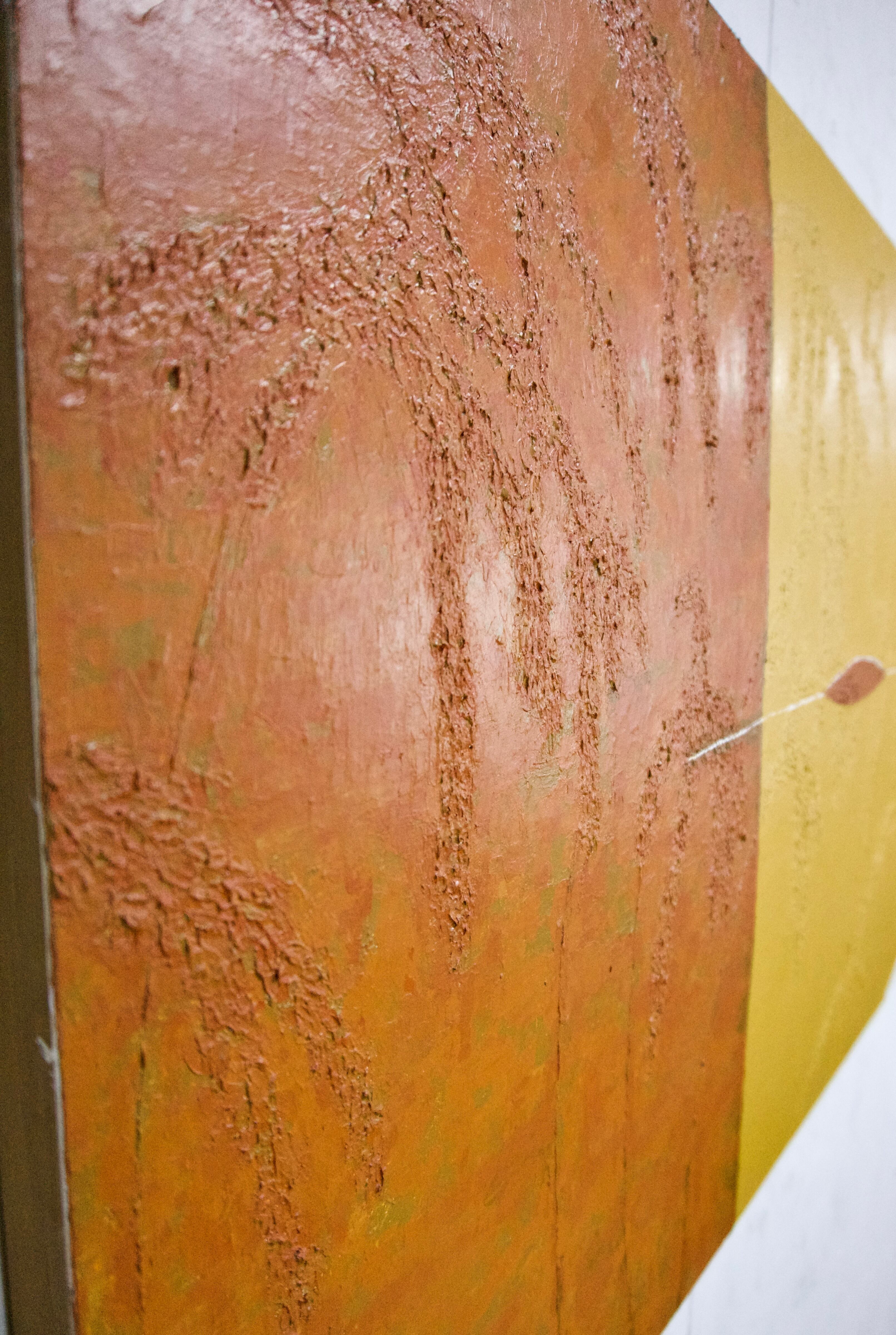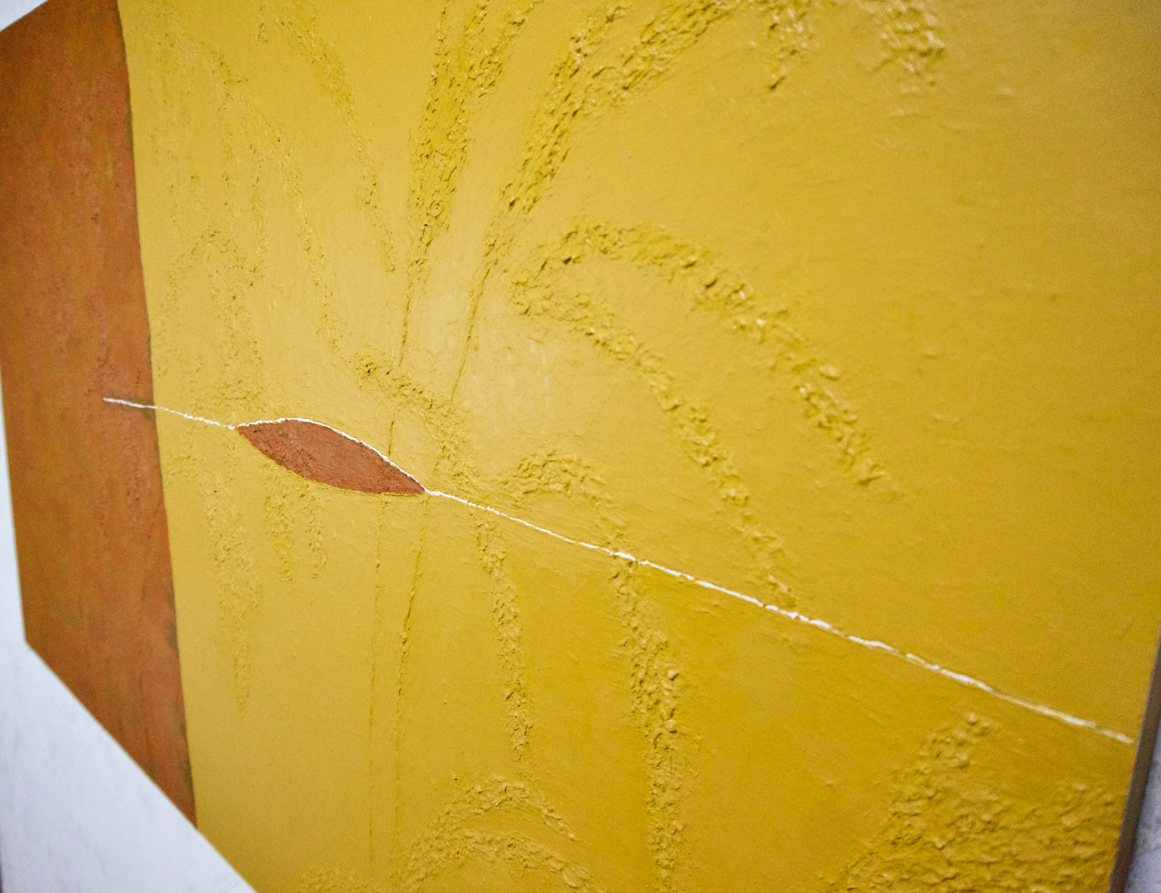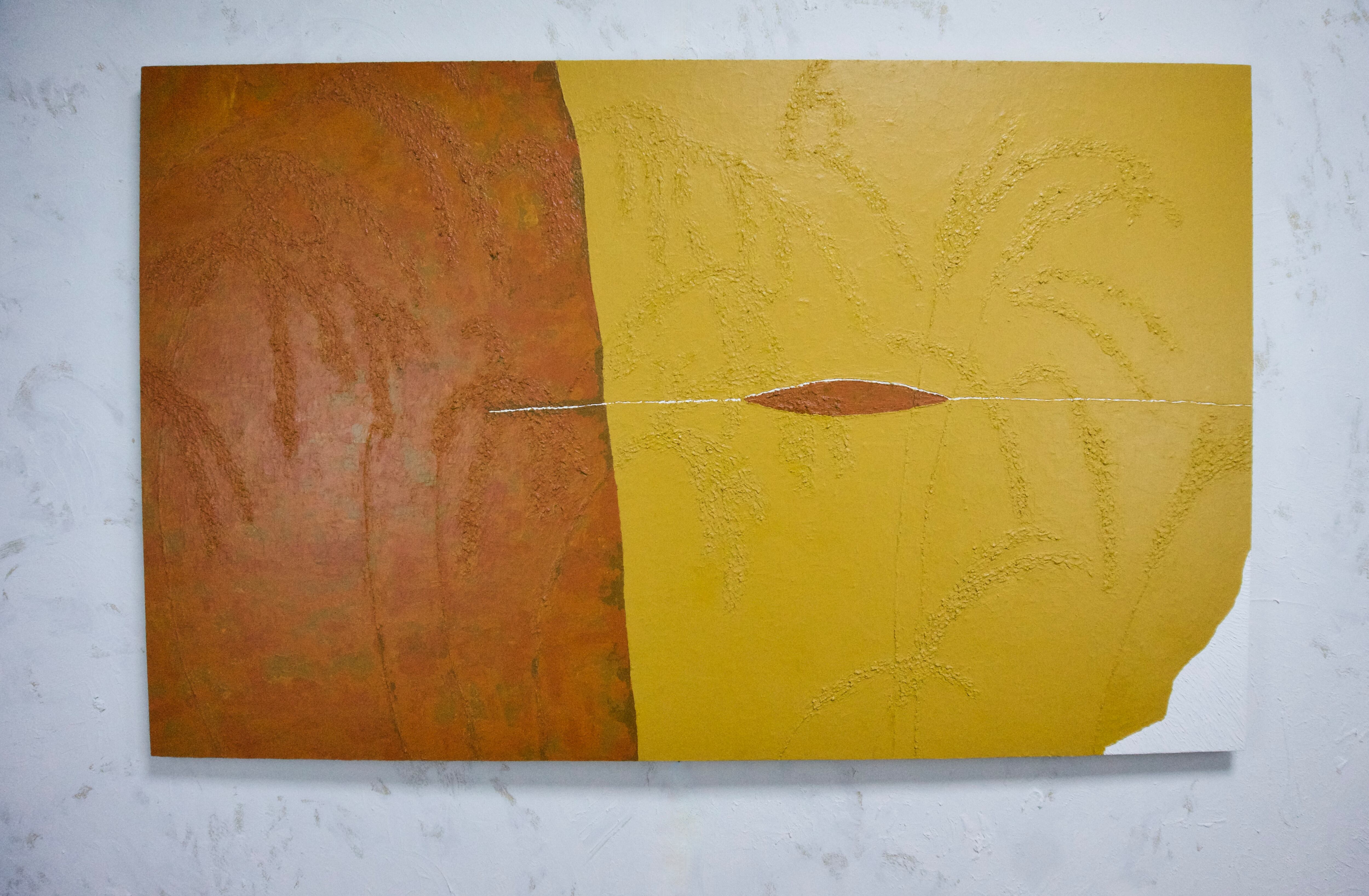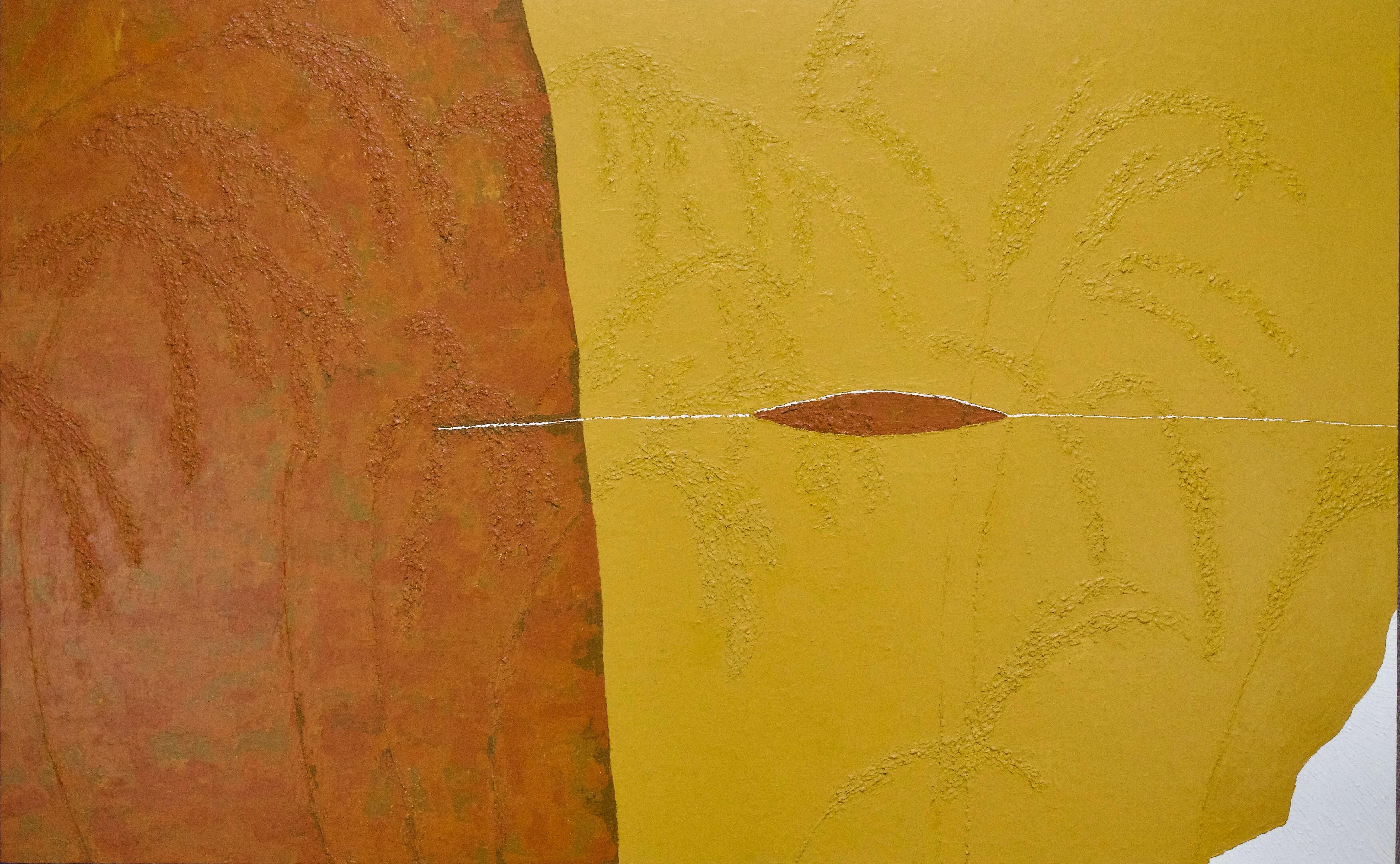 画面を横断する繊細な白いラインと、その中央に配された赤い象徴的なフォルム。それは、繁栄の源となる「種」のようでもあり、あるいは天と地を繋ぐ「眼」のようでもあります。背景に施された有機的なマチエール(質感)は、地から芽吹く植物の生命力や、神聖な光の粒を思わせ、画面全体に豊かなリズムを与えています。
