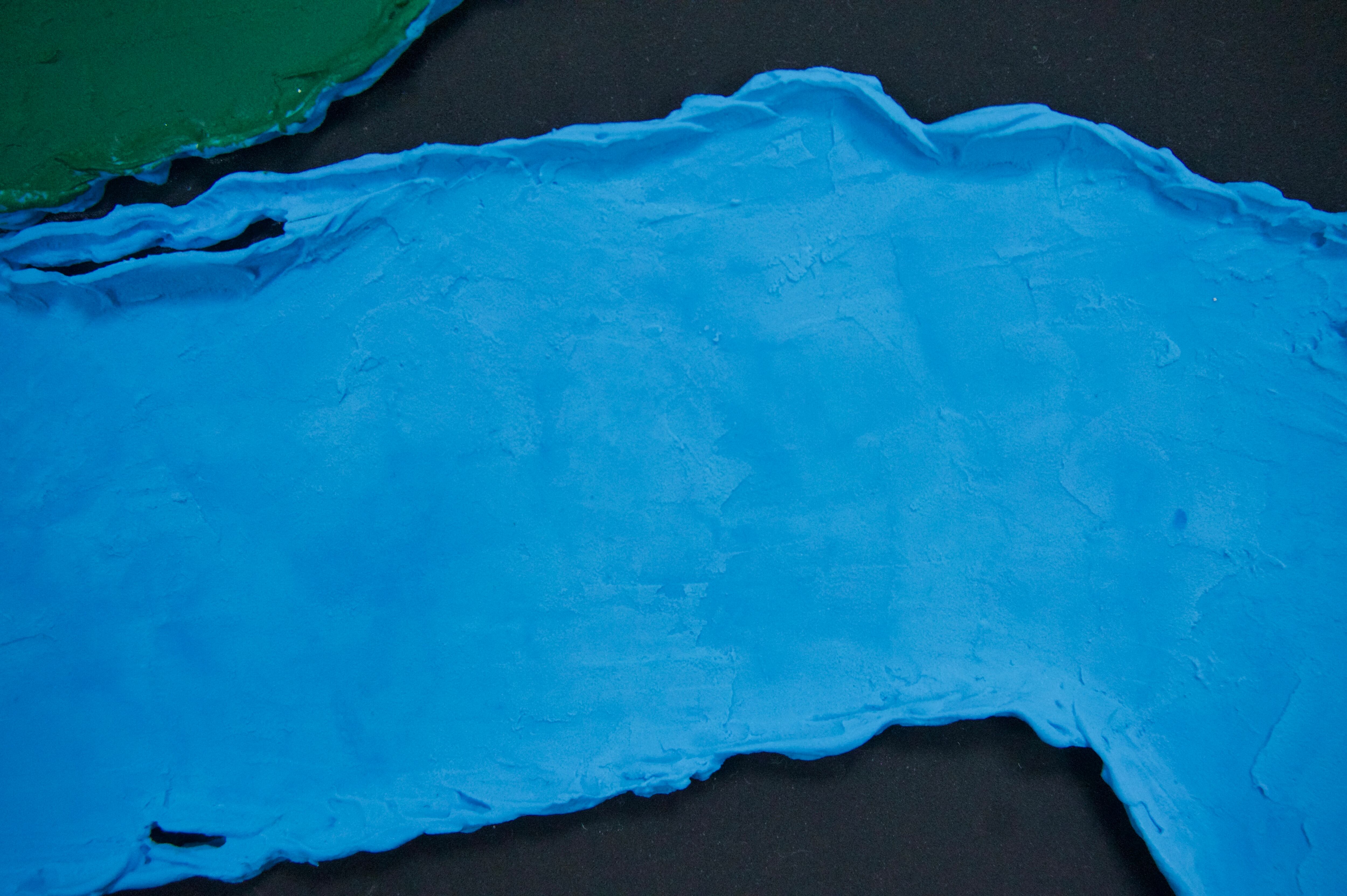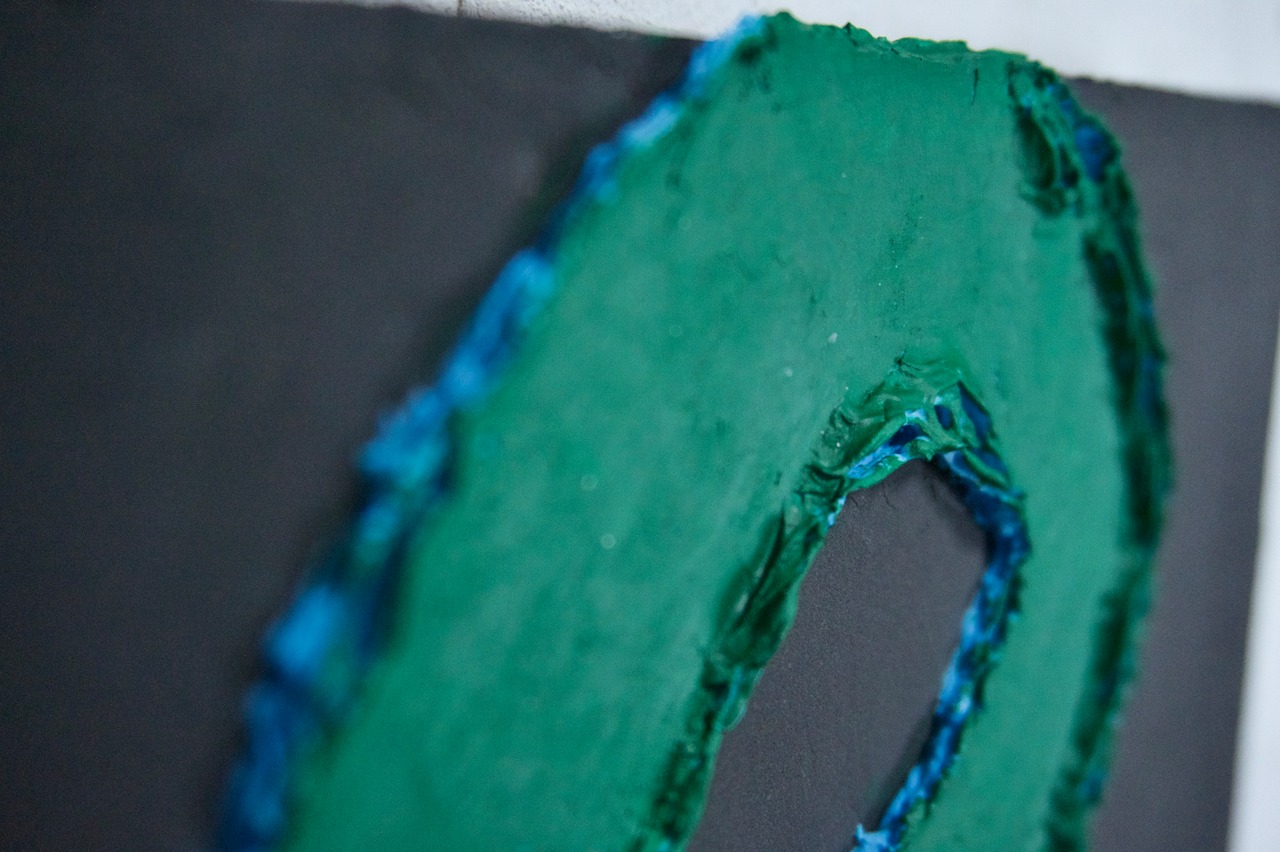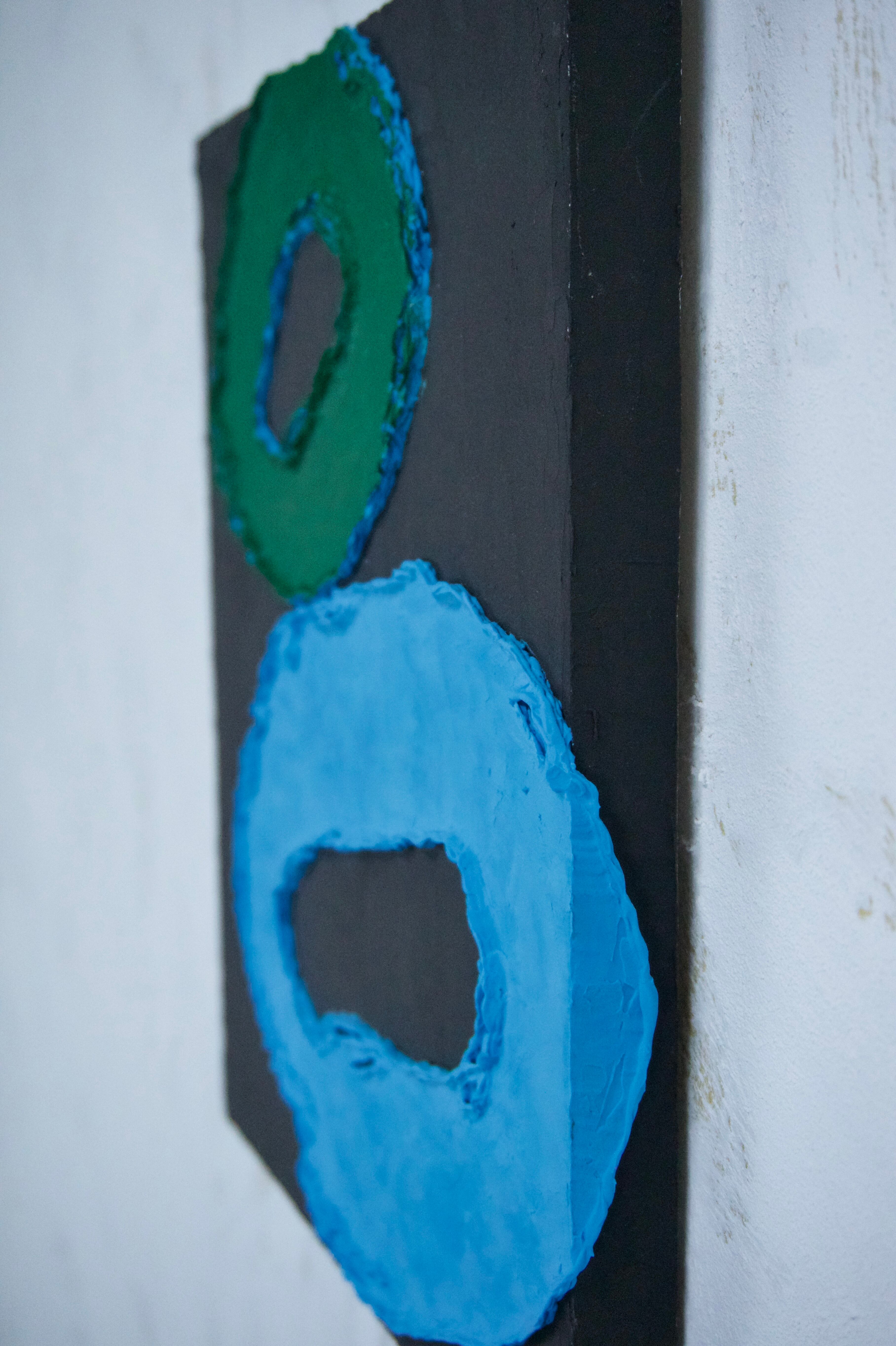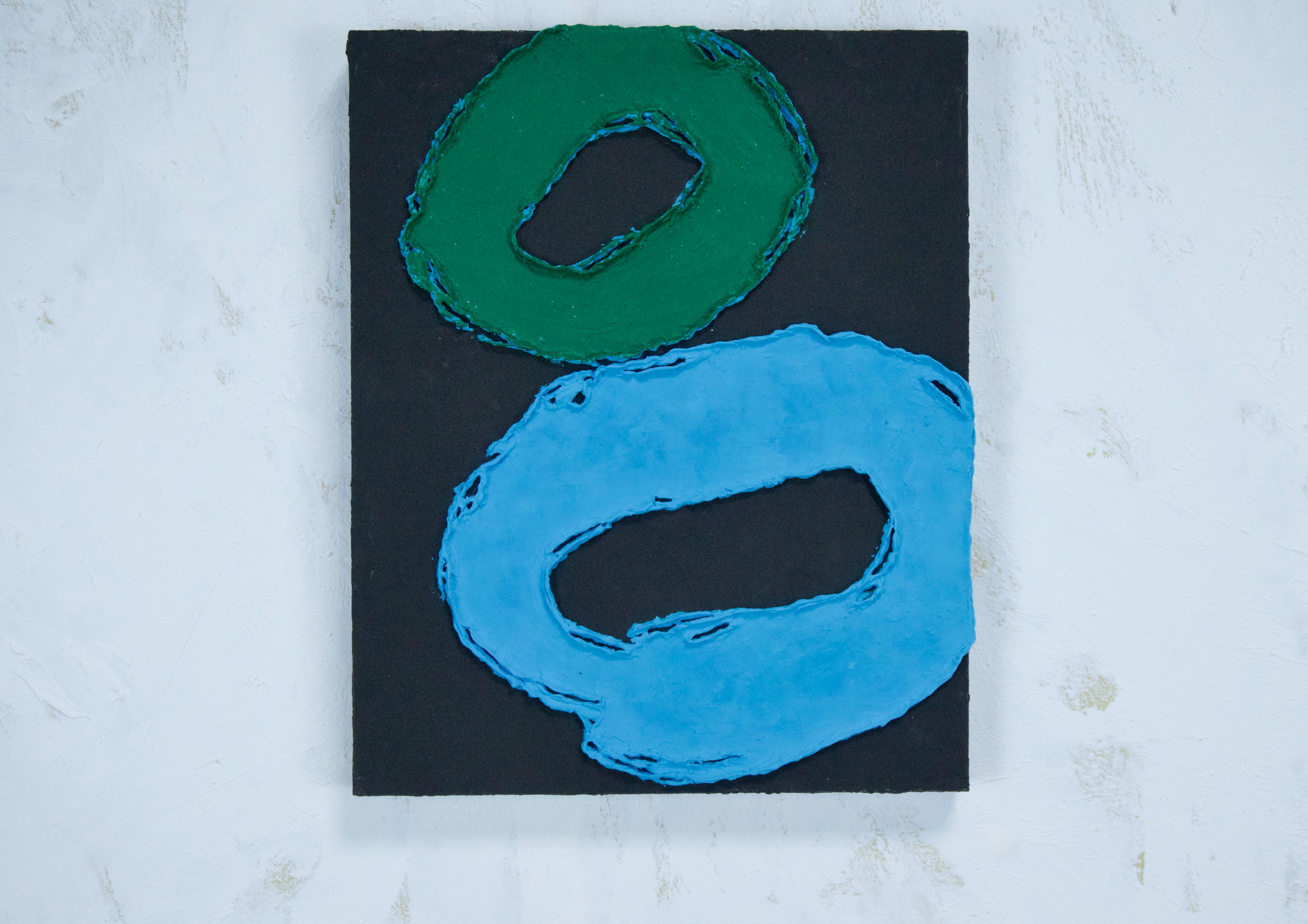 深い黒の地の上に、質感豊かな緑と青の二つの環を配した、立体感のある作品です。